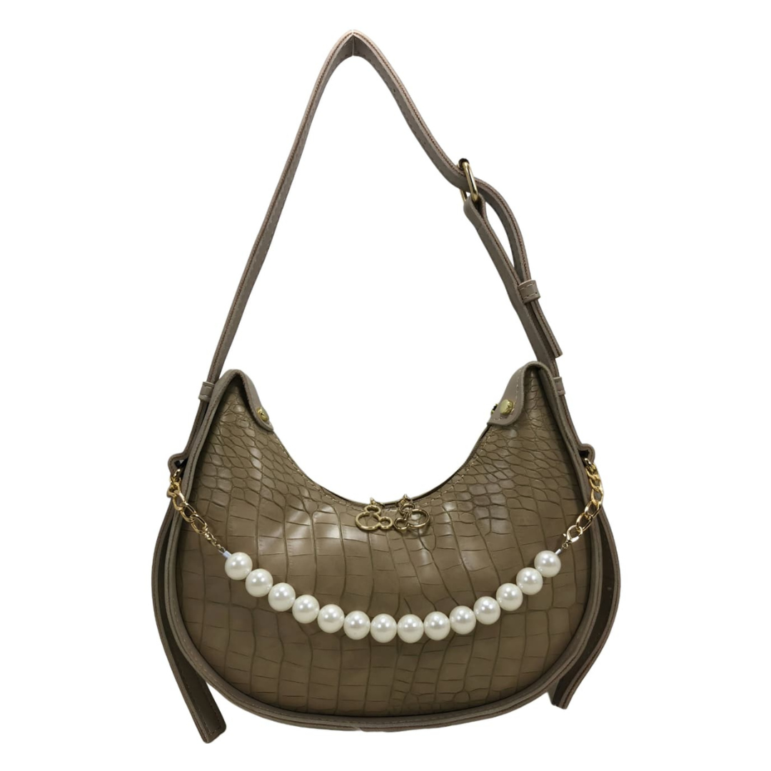 This FMLV handbag features a premium croc textured exterior and a smooth curved silhouette that adds elegance to any outfit The pearl charm detail paired with gold hardware offers a refined fashionable look The adjustable strap ensures comfortable wear and the secure zip closure keeps belongings safe The spacious interior provides room for everyday essentials making this bag a perfect blend of style and practicality