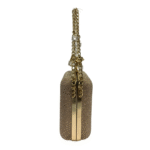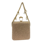 Step into sophistication with the FMLV Elegant Gold Evening Clutch, a statement accessory crafted for those who appreciate refined luxury. The clutch showcases a beautifully textured, shimmering gold exterior that catches the light from every angle, adding a subtle yet captivating sparkle. Its standout feature is the unique pearl-topped ring clasp, offering both secure closure and a touch of vintage charm.