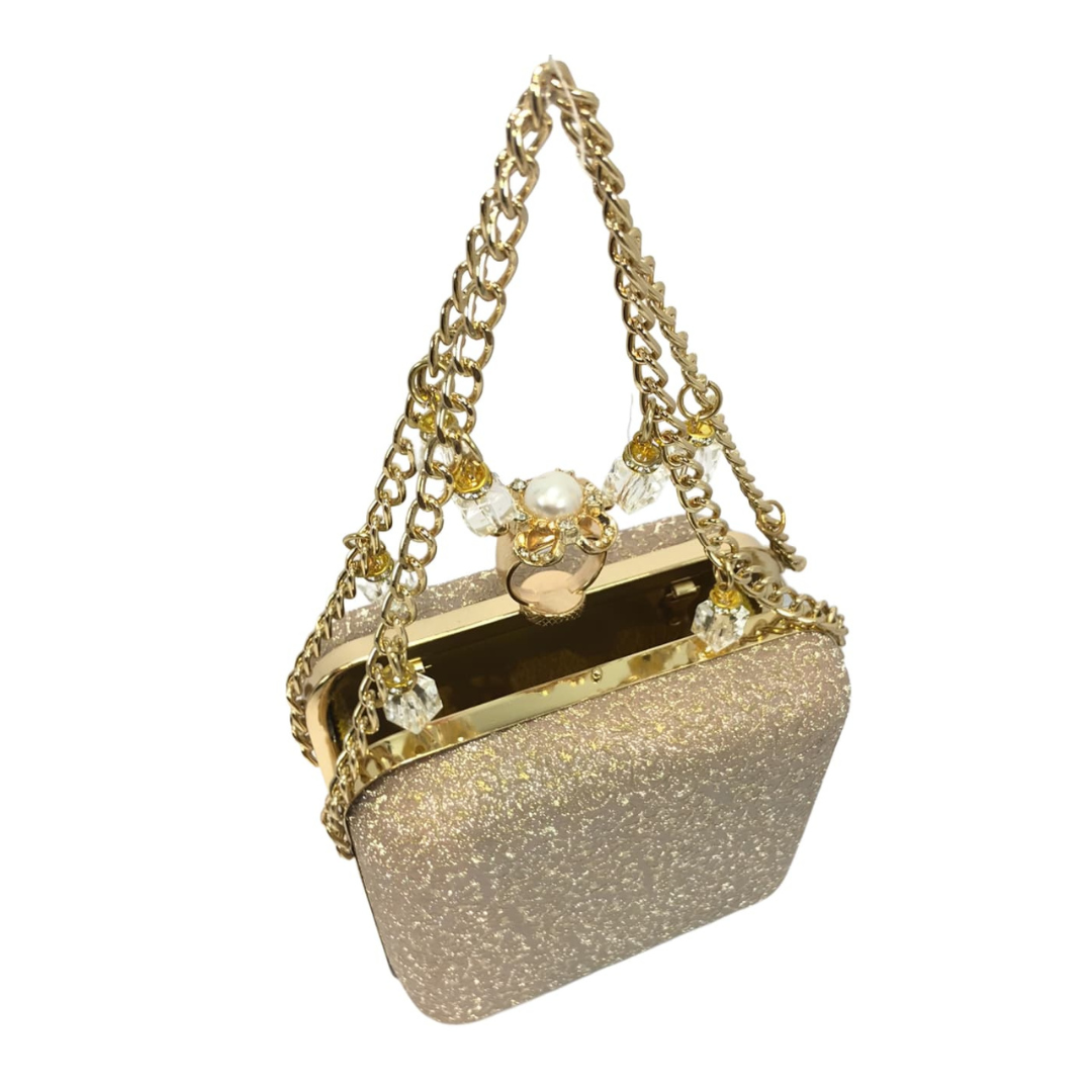 A glamorous FMLV gold clutch featuring a textured shimmer finish a decorative pearl ring clasp and a chic chain handle adorned with crystal accents